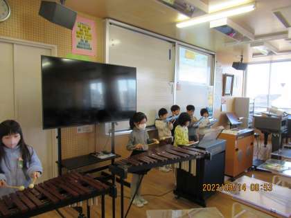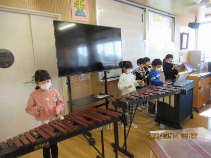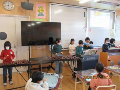 音楽科では、3つのパートに分かれての合奏に挑戦しました。鍵盤ハーモニカが担当する主旋律パート、木琴パート、バスマスターの低音パートに分かれ、それぞれの楽器の音をよく聴き合いながら演奏を楽しみました。