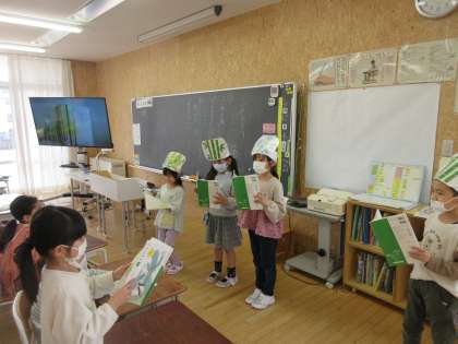国語科で「ふきのとう」の学習をしています。登場人物のふきのとうや、竹やぶ、雪になりきって音読練習をしています。「『ささやいています』だから、小さな声だと思うよ。」「早く外が見たいんだよ。」など、登場人物の様子や気持ちを想像している子供たちです。