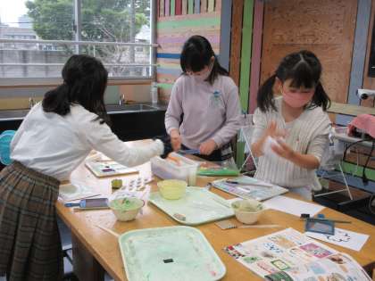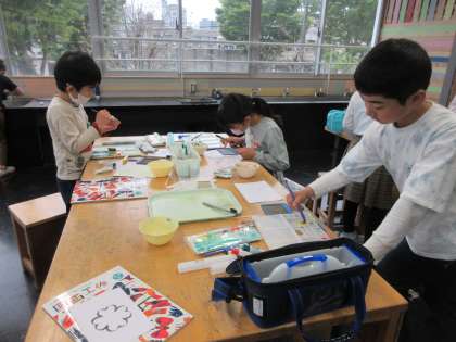 図画工作科の時間に、絵の具と様々な用具をつかって、模様を描きました。用具の使い方を工夫して、イメージを広げながら表すことを楽しみました。