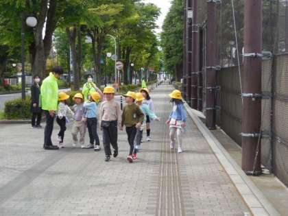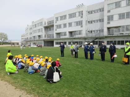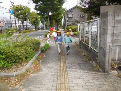 今日は、交通安全教室を行いました。警察署や交通安全協会、PTA等、たくさんの方々に見守られる中、歩行訓練を行いました。