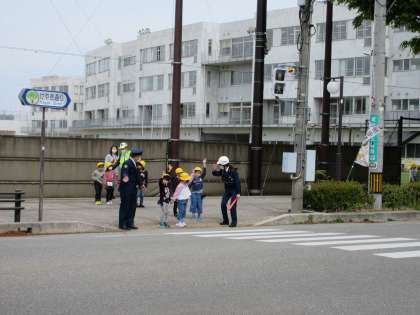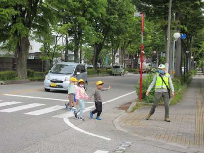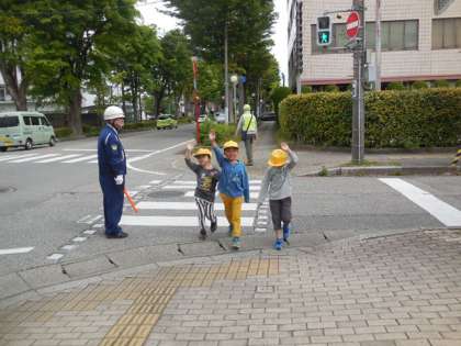 横断歩道を歩くときは、右左右を確かめ、手を挙げて渡ります。どうして手を挙げるのか、教室でその理由を考えました。