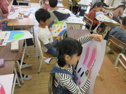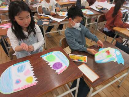 図工の学習で、「ふしぎなたまご」を描いています。たまごが割れると、何が出てくるかな...、わくわくしながら、たまごの模様を描いたり、はさみでたまごを切ったりしました。いろいろな生き物や、好きな食べ物、きょうりゅう等、楽しそうな世界になりそうです。