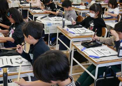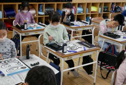 毛筆での学習が始まった3年生です。墨液をすずりに出すときには、とてもどきどきしていたようです。筆を正しく持ち、腕を動かして書くことができました。
