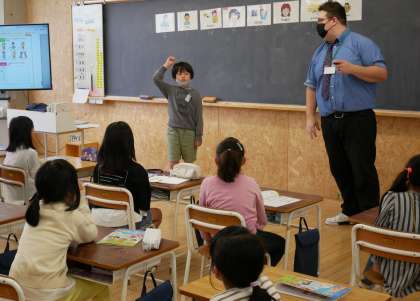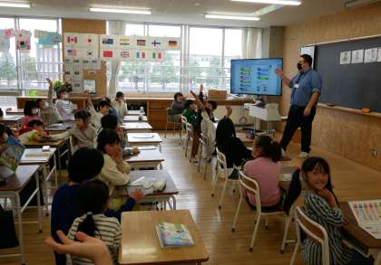 外国語活動では、「sleepy」や「happy」などの状態を表す表現を学びました。友達のジェスチャークイズを通して、表現に慣れ親しんでいました。