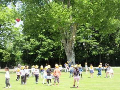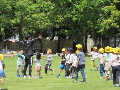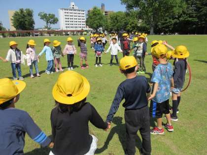 晴れ渡った空の下、城址公園に出かけ、芝生広場で思いっきり身体を動かして遊びました。クラス対抗のフラフープゲームに挑戦したり、「猛獣狩りに行こうよ」で仲間づくりを楽しんだりしました。芝生広場全体を使っての「こおり鬼ごっこ」や大きなシンボルツリーを利用して「だるまさんが転んだ」等、ダイナミックな遊びを楽しむ様子が見られました。