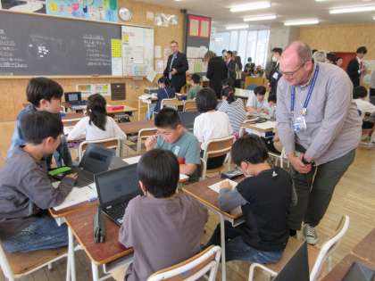 給食の後には、3年生から6年生の学習の様子を参観されました。芝園小学校の「自分で決める」学びのスタイル、「self−determined」learning styleをじっくり見てもらいました。世界の国々に興味をもち、進んでかかわろうという子どもたちの意識がぐんと高まる経験になりました。