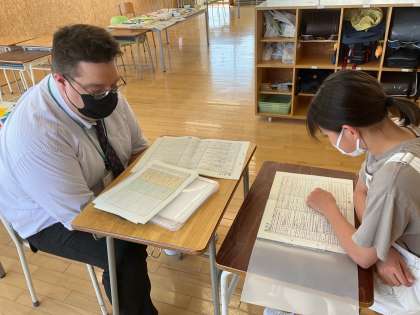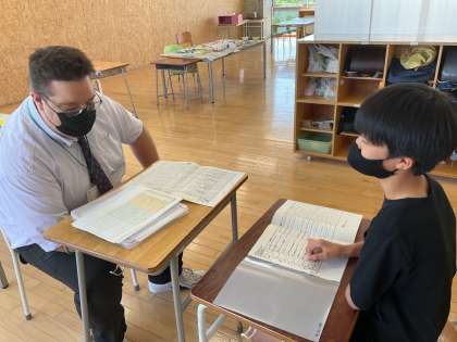 外国のゲストの方にも思いが伝わるように、6年生は、日本語、英語、スライドの3つのチームに分かれて活動しました。英語チームはALTの先生に個人レッスンをしてもらい、発音やニュアンスなどを教えていただきました。