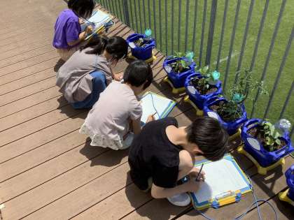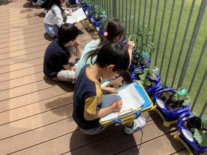 自分の選んだ野菜を観察している様子です。触った感じ、匂い、変わった様子に注目して真剣に観察していました。おいしい野菜ができるようにお世話を続けていきましょう。