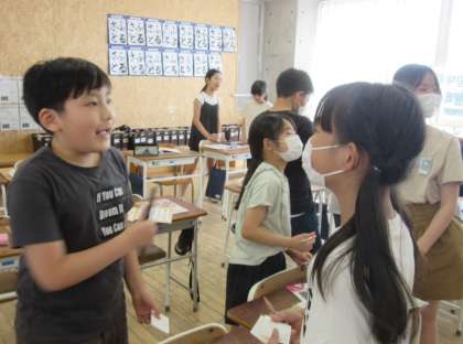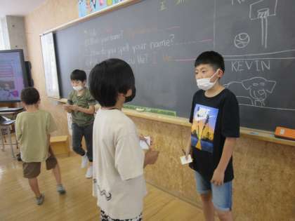 5年生の外国語科では、名刺カードを使って、自分の名前や好きなスポーツ、食べ物などを英語の表現を使って相手に伝えました。自分の好きな物を伝えたり友達の好きな物をきいたりして外国語に親しんでいました。