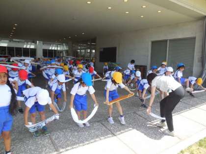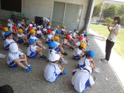 1年生は、体育の学習で、タオルを使って体ほぐしを行っています。普段使わないところをぐっと伸ばすことで、「いたたたた・・・」と言いながらも、気持ち良さそうにしています。また、今日は、ソフトボール投げの投球フォームの確認をタオルを使って行いました。
