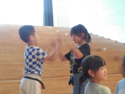 貨物列車の後は、ペアになって「セブンステップス」を歌いました。自分たちで振り付けを考え、リズムに合わせて楽しく踊りました。