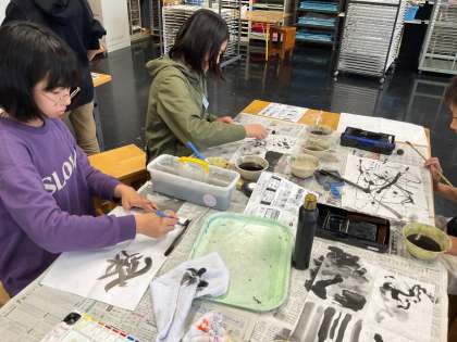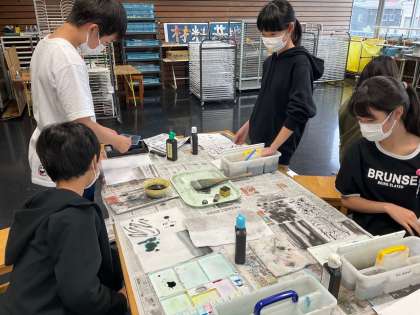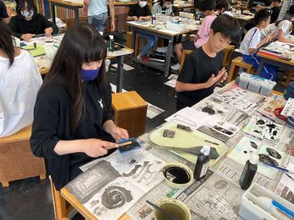 6年生は、図画工作科で、墨絵に挑戦しています。初回は様々な技法を体験しました。「濃淡」「にじみ」「かすれ」「ハケやスポンジを使った模様」など、子どもたちは「おお、面白い模様ができた」「わぁ、いい感じのグラデーションになった」とうれしそうに取り組んでいました。