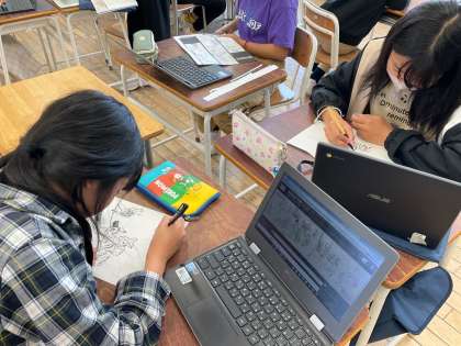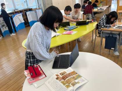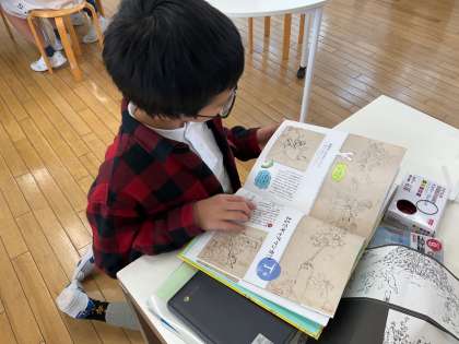 国語科「鳥獣戯画を読む」から生まれた「問い」を追究しました。実際に絵巻物を作って動いたように見えるのか確かめたり、筆者が「素晴らしい」と絶賛する筆捌きを自分も描いて体験したり、同じ時代の絵巻物と比較したりと、それぞれの思いや願いを大切にして学びました。