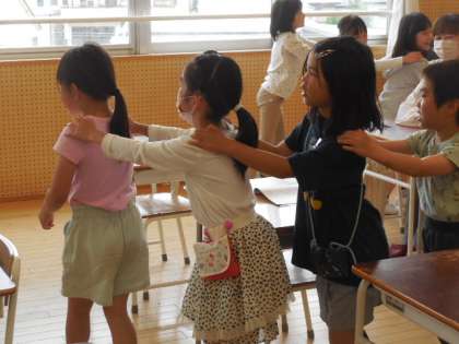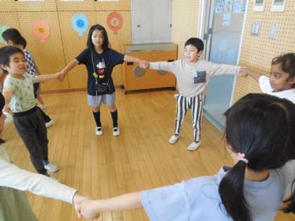 「かもつ列車」にもすっかり慣れて、グループを作るのが上手になりました。また、「ひらいた ひらいた」の曲に合わせて、グループで表現遊びをしました。