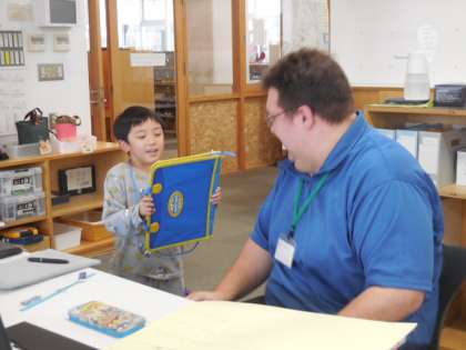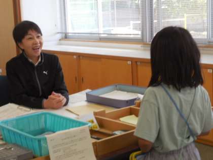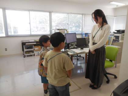 かがやきタイムの時間に、教職員の方々にインタビューに行きました。職員室では、ドキドキしながら校長先生に話しかけ、質問をしたり握手をしてもらったりして、楽しく活動することができました。