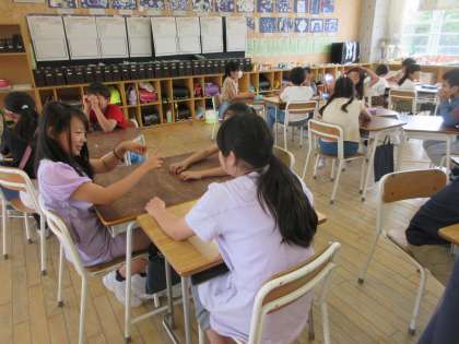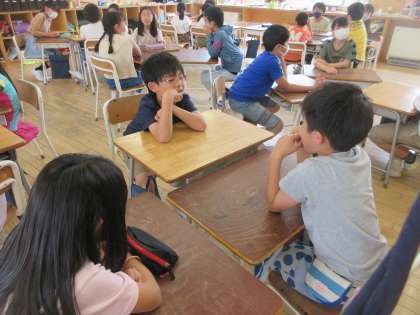 道徳科の時間に、人とよりよい関係を築くためには、どのような話の聞き方をするとよいのか考えました。実際に「話す人」「聞く人」「よい聞き方ができているか観察する人」に分かれてロールプレイングを行いながら、相手の話に注意を向けて聞くと、お互いによい気持ちになることに気が付くことができました。