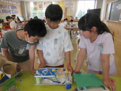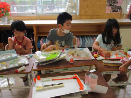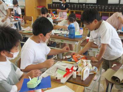図画工作科でつくっている「コロがるくんの旅」が、完成に近付いてきました。回を重ねるごとに、イメージに合うコースをつくることができるようになり、友達とアドバイスし合ったり、つなげたりしながら、つくることを楽しんでいました。