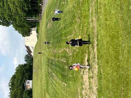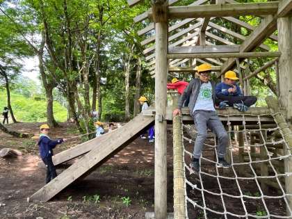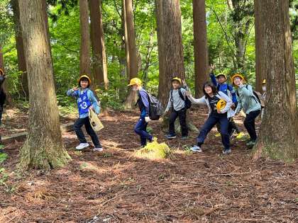 落ちている枝を拾ってキャンプファイヤーの材料にしたり、動物の抜け穴を探したり、ビンゴカードと地図を頼りに森の中を探検しています。