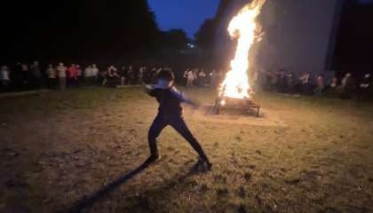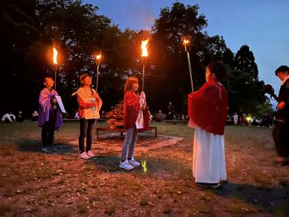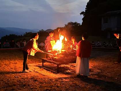 火の神から、個性の火、協力の火、挑戦の火を授かり、点火しました。点火後にパワフルパワーを歌い踊りました。