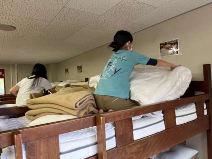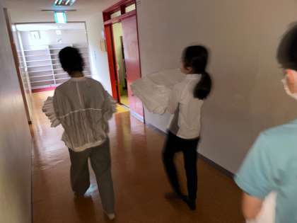 2日目がスタートしました。朝起きたら、ベットやシーツを片付けました。きれいに畳めるようにみんなで、協力しました。なんた、おさるさんにも遭遇しました。