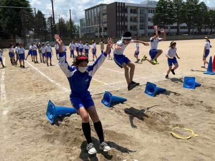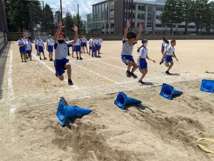 6年生は体育で走り幅跳びの学習をしています。助走、踏み切り、空中でのフォームなど、一つ一つ意識して練習に取り組んでいます。