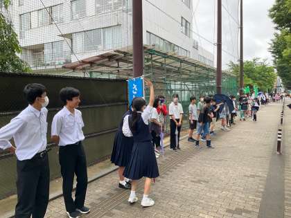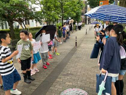 芝園小学校、芝園中学校、中部高校、3校合同挨拶運動が行われました。1日目は、3年生と6年生が挨拶運動に参加しています。3年生は手作りのカードをもって参加してくれました。計画委員会は、挨拶運動の様子を取材して、お昼のテレビ放送で紹介します。