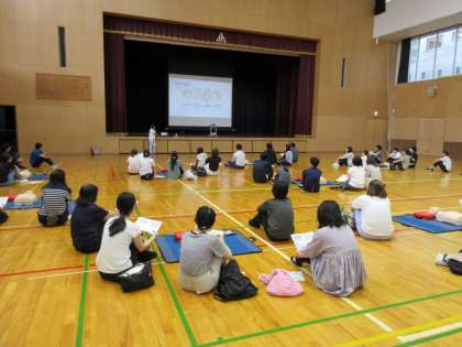 子供たちが楽しみにしているプール開きが近づきました。安全な水泳学習に取り組めるように、PTAの方々も参加されて救急救命講習が行われました。赤十字の指導員の方から胸骨圧迫、AEDの使い方などを教わり、人形を使って実践しました。どんな事態にも対応できるように皆真剣に取り組みました。