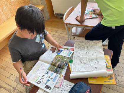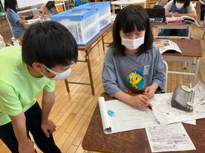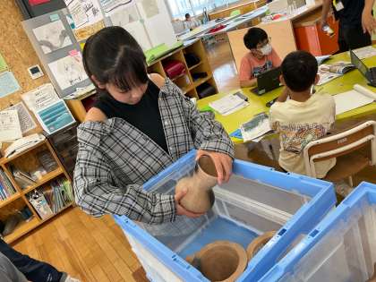 6年生は、社会科で、歴史の学習をしています。縄文、弥生、古墳時代の世の人々の生活の様子を、教科書や資料集を中心に調べ自ら学んでいます。巻物にびっしり考えを書き込んだり、土器の模型を実際に触ったり、インターネットで遺跡の様子を調べたりしています。1人で集中したり、仲間と一緒に調べたり、自ら学び方も決めています。