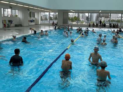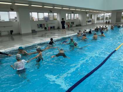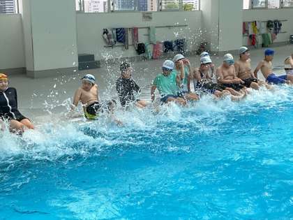 6年生は、初泳ぎをしました。プールサイドに座ってバタ足をしたり、団ごとに手を繋いで水に浮かんだりして、久しぶりの水に慣れる運動をしました。少し泳ぐ練習をした後には、お楽しみの自由時間もエンジョイしました。