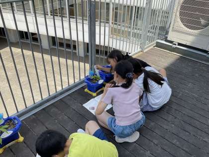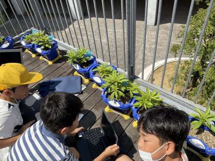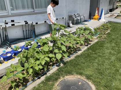 春から育てているホウセンカやヒマワリの育ちを観察しました。子葉が出たころと比べて、変化の様子をとらえました。