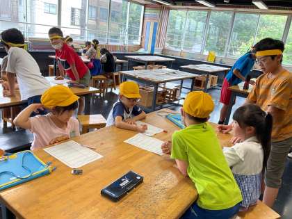 はじめは、緊張していた子供たちも少しずつ打ち解けて、名前だけではなく、読んで欲しい名前や、好きな色など、質問しました。カードに名前が集まってくると「やったー、みんなの名前を集められたよ」「後、3人だ、まだしていないのは誰かな」と名前を集めたカードをうれしそうに見つめる姿が見られました。