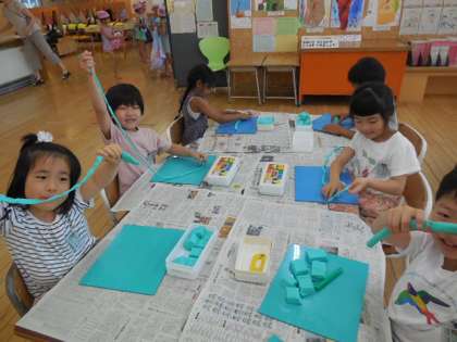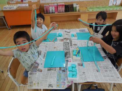子供たちは粘土が大好きです。今日は、粘土をひも状にして楽しみました。細く長く伸びた粘土をぐるぐる巻いて「カタツムリみたい!」と歓声を上げていました。