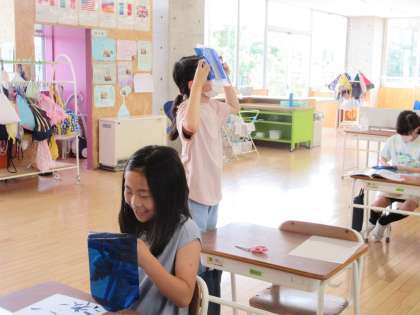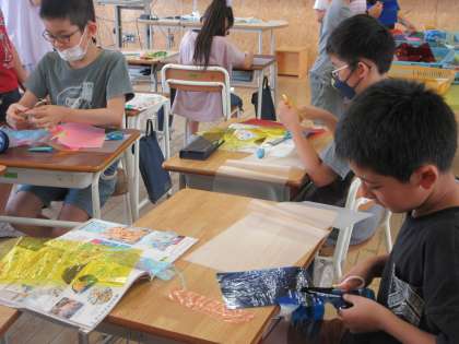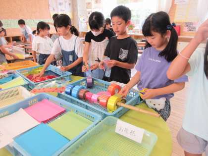 図画工作科では、カラーセロファンやお花紙など、光を通す材料を使って、色の重なりを楽しみながら作品をつくりました。できあがった作品を飾ると、雨の日も心が少し晴れやかになります。