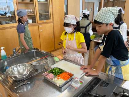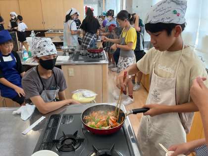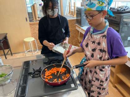 材料の準備ができたら、炒めていきます。硬い野菜から順番に、油のはねや、焦げないように気をつけて炒めました。