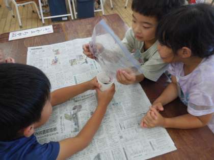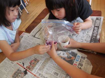 アサガオのしぼんだ花を摘んで、色水をつくりました。鮮やかな赤色の色水ができました。和紙に垂らして、色がにじんでいく様子を楽しみました。