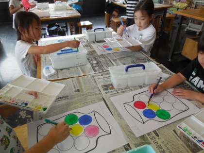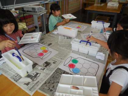 今日は図画工作科の学習で、絵の具を使いました。水入れやパレットの使い方、色の出し方などを学んだ後、好きな色10色でビー玉に色を付けました。