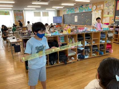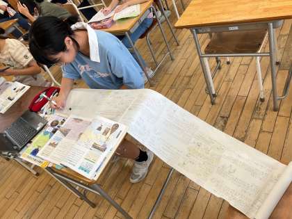 社会科で奈良時代の学習をしています。「問い」を大切にして自ら調べ、考えたりまとめたりしています。奈良の大仏の耳の大きさを物差しを使って確かめたり、調べたことを巻物にまとめたり、黒板に書いたりして自分らしく学んでいます。大仏の名前やポーズの意味を調べて、そこにも聖武天皇の世の中を平和にしたいという思いを感じ取っていました。