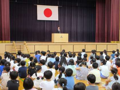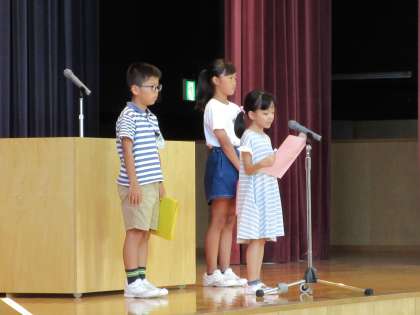 全校が集まって1学期の終業式を行いました。1学期の成長ぶりが伝わる終業式でした。1、3、5年生の代表児童が、仲間と磨き合い共に成長できたことを力強く発表しました。