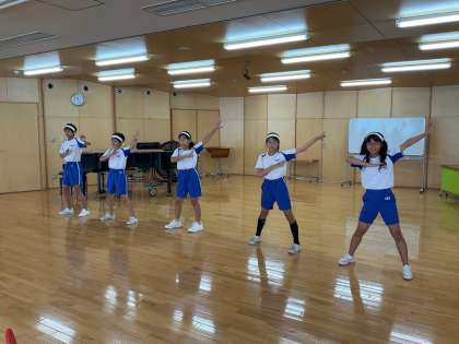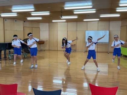 6年生が考えた応援を全校に伝えるためにビデオ撮影をしています。白団の様子です。映っていない人もカメラの後ろで声で盛り上げています。