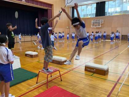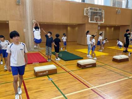 雨だったので、体育館で走り幅跳びの動きを一つ一つ確認して、フォームを意識して跳ぶ練習をしました。意識して動くことで、動きが変わってきています。