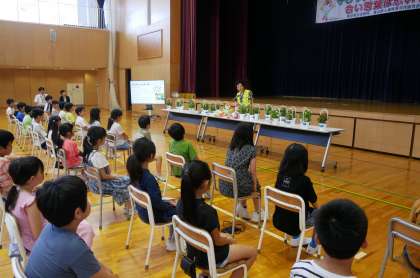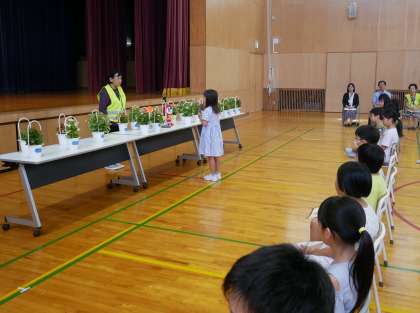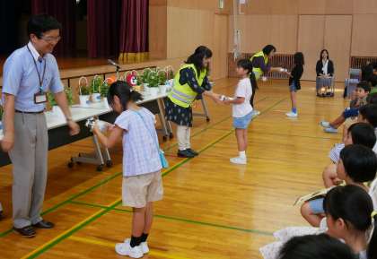 法務局や人権擁護委員の方々をお迎えし、人権の花の終了式・伝達式が行われました。7月にいただいたベゴニアは、子供たちが人権について学習し、大切に育てたことで、「人権の花ベゴニア」になったというお話が、とても印象に残ったようです。真剣に話を聞く子供たちの態度がとても立派でした。