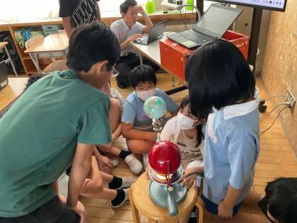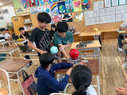 地球、太陽、月の模型を使いながら、日によって月の形が変わる理由を考えたり確かめたりしました。