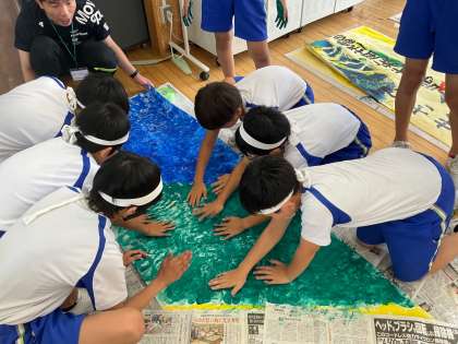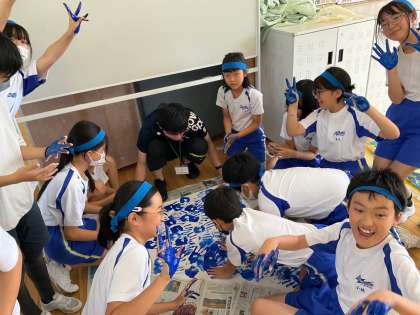白団と青団の様子です。絵の具の感触を楽しみながら、心を込めてスタンプをしました。