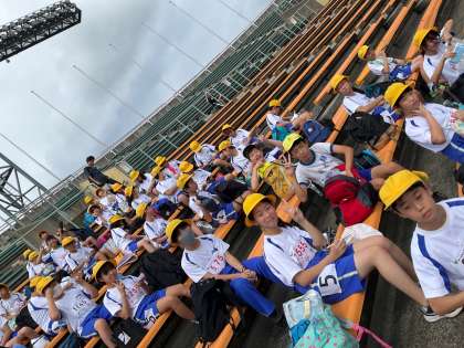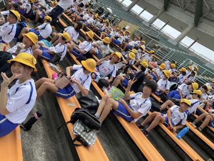 競技場に到着しました。会場の雰囲気を味わいながら、お家の人が準備してくださったおいしいお昼ご飯を食べて元気を充電しています。