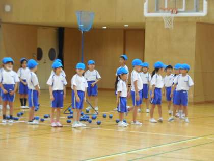 今日は、玉入れの並び方を練習しました。1回で場所を覚え、2列から1列に隊形移動することも上手にできました。