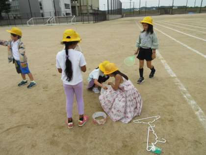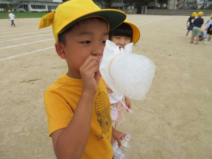 自分で工夫した材料を使って、しゃぼん玉遊びをしました。うちわを使ってたくさんのしゃぼん玉を飛ばしたり、サランラップの芯で大きなしゃぼん玉を作ったり、思い思いに遊びました。