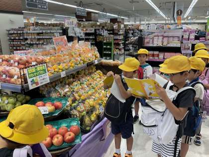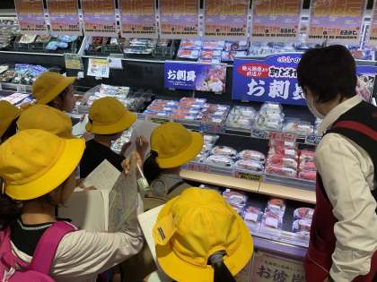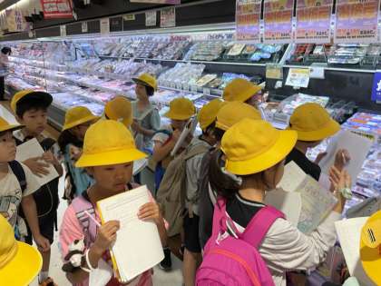 社会科の学習では「お店ではたらく人」という学習を進めています。学習の一環で、スーパーマーケットへ見学に行き、お店の方から商品の並べ方や温度の管理、お知らせ等の工夫について話をしていただきました。見学に行くことで、子供たちの学習意欲の高まりが感じられました。