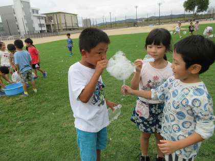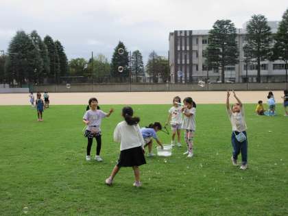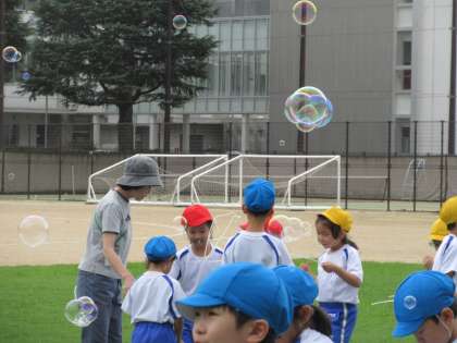 前回の「しゃぼん玉あそび」の経験を活かし、道具を改良したり吹き方や飛ばし方を変えたりする工夫をしながら活動しました。大きなしゃぼん玉や連続したしゃぼん玉がとんでいく度に「きれい」と歓声があがりました。