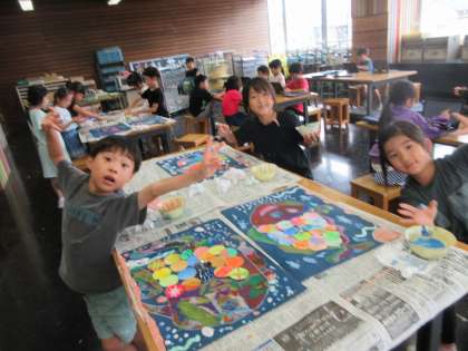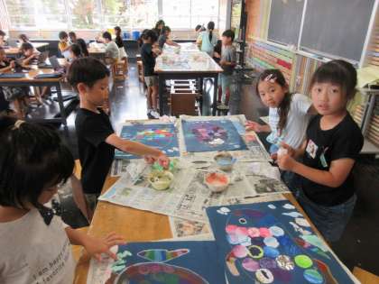 魚の鱗に様々な色を彩色した後、仕上げに液体粘土を使って背景を仕上げました。子供たちは、初めての液体粘土の感触を楽しみながら取り組んでいました。みんな素敵な作品が仕上がりました。