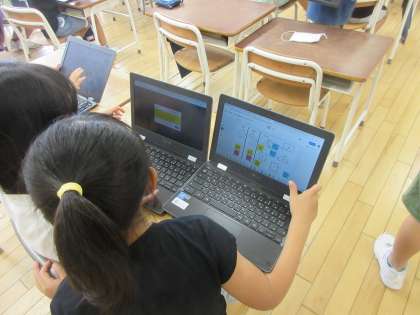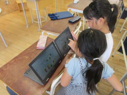 算数の授業では、図形の勉強をしています。クロームブックを使って、三角形と四角形とそうでない形に分けて、図形の特徴について調べました。友達と協力して問題に取り組む姿が見られました。
